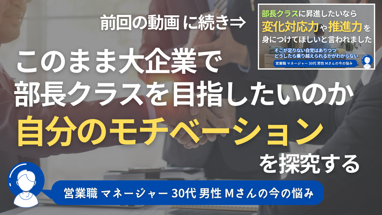 「もうちょっとヒントが欲しい」みたいに言っていたところに対して、もう少し話してみると、Mさんのキャラや個性、才能とか含めていうと、本当に最初の第一歩みたいな感じですけど、今いる自分のチームメンバー、部下みたいな人たちの中で、「やっぱ、この人を引き上げてやりたいな」とか、「この人から尊敬され続ける存在でありたいな」みたいなことは、Mさんにとってはモチベーションになるような気がします。