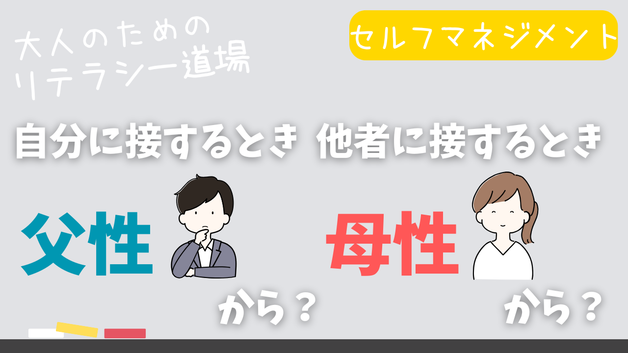 例えば、会社で嫌なことがあった、ストレスを感じることがあった。そういうことがあったときに、自分をちゃんと自己分析して、自己改善して、よい未来をつくっていこうと考えて、「なんでこう捉えちゃうんだろう」「どう捉えたらいいんだろう」「自分の何を直せばいいんだろう」という風に、分析的に自分に対してアプローチしたり、場合によっては、それで自分を責めてしまうといったことも、あったりすると思います。これは非常に父性的なアプローチです。