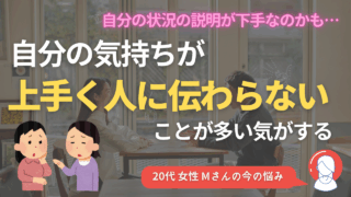 人間関係全般 自分の気持ちが上手く人に伝わらないことが多い|自分の状況説明みたいなことが下手なのかも… 自分の気持ちが、特に感情そのものというか、何で今こういう気持ちなのかの説明のところが上手く人に伝わらないなぁ…ということがよく起こっています。「あ、伝わってないなあ」みたいなになるんだけど、あんまり言葉が出てこないというか、どこの前提から話せばいいんだろうかとか、そこにモヤモヤってなることがあります。 2025.09.19 【大人のための】総合的な探究の時間人間関係全般